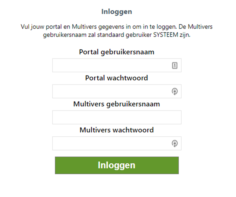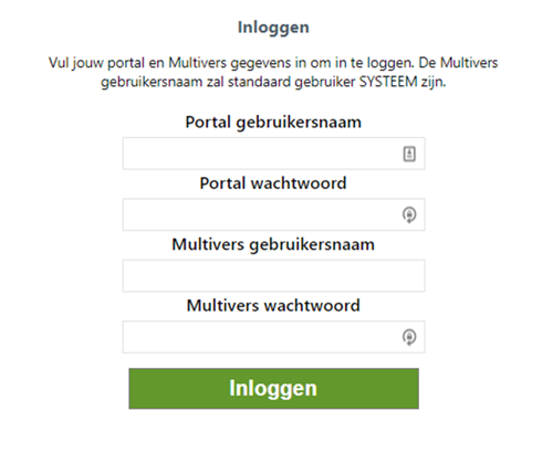 Die vullen ze dan in bij portal gebruikersnaam en wachtwoord. Bij Multivers gebruikersnaam vullen ze “SYSTEEM” in en wachtwoord moet niet ingevuld worden.