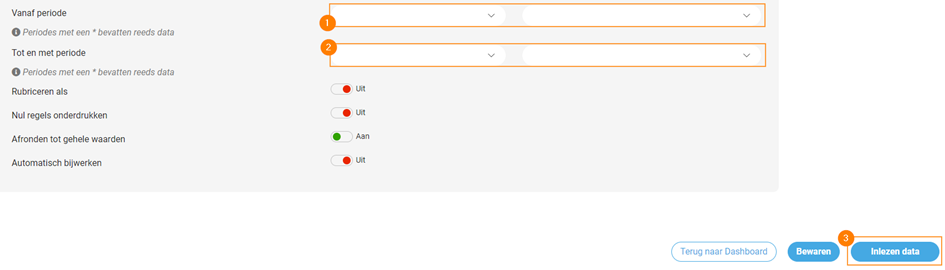 Je kunt nu de gekozen periode(s) inlezen door op de knop “Inlezen data” (3) te drukken.