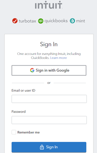 Als je QuickBooks Online gekozen hebt komt het inlogscherm van QuickBooks Online naar voren, hier kun je inloggen met jouw QuickBooks Online gegevens.