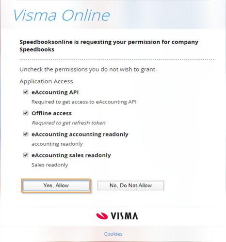 Selecteer hier “Yes, Allow”, deze knop geeft Speedbooks® de rechten binnen het boekhoudpakket om de gegevens uit te kunnen lezen.